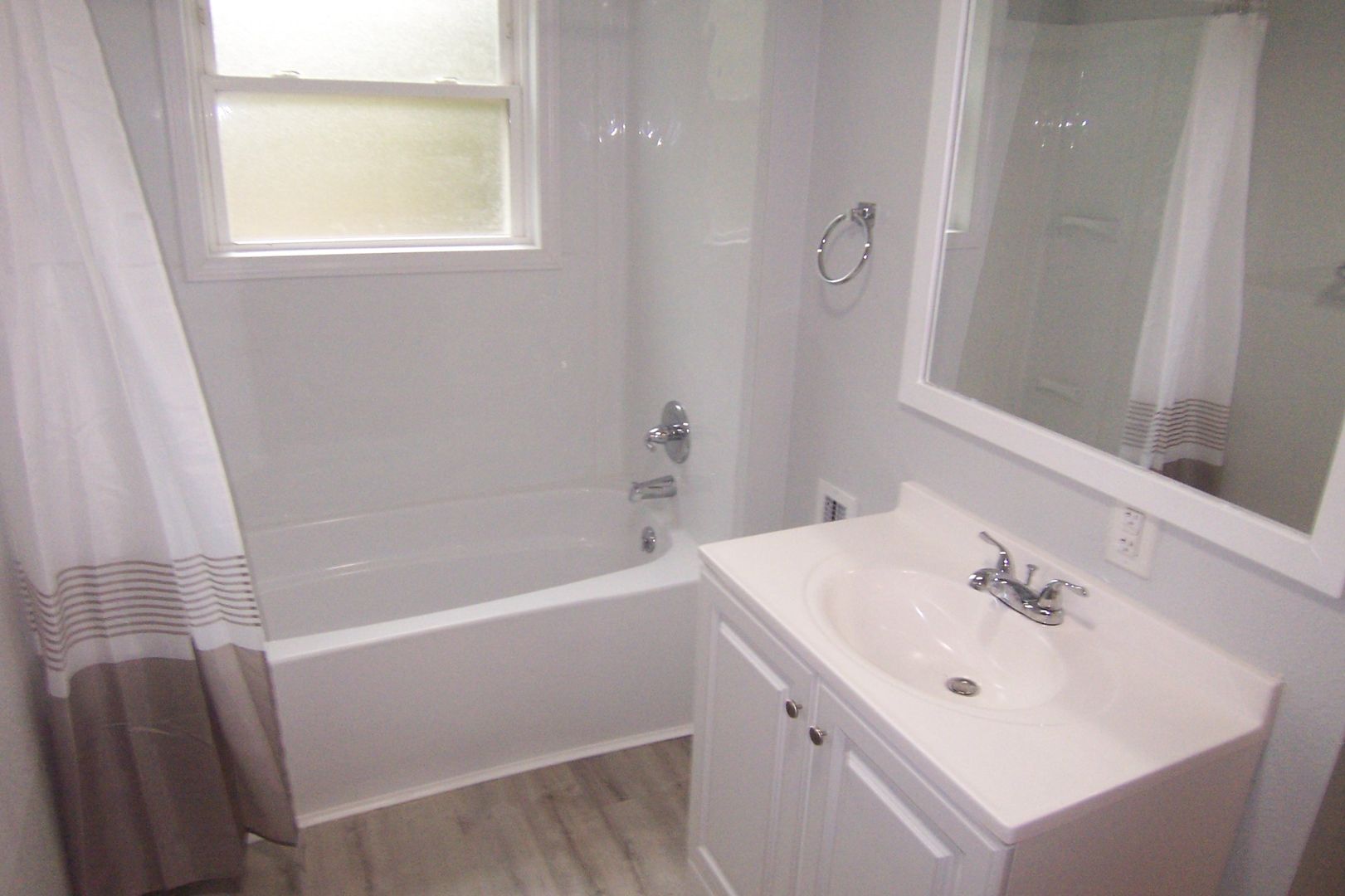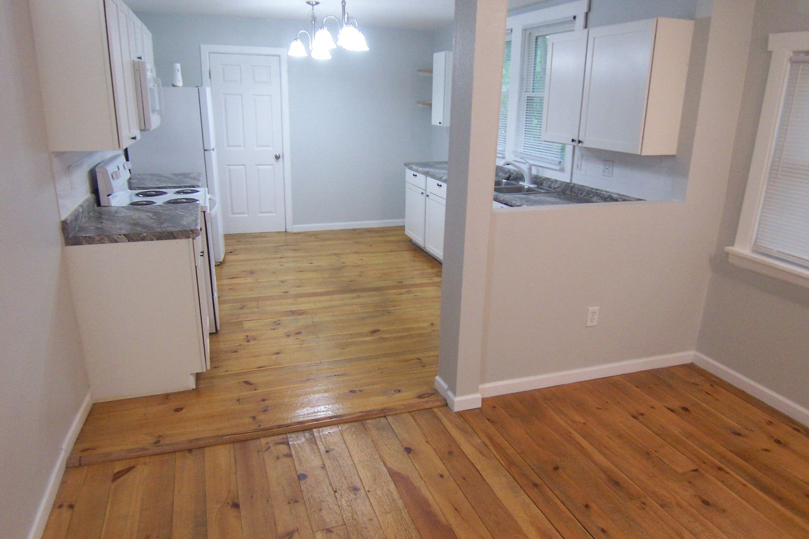 All wood floors in all of downstairs except bath with 10' ceilings makes for a great spacious feel. The kitchen is fully updated with electric range, microwave, dishwasher and refrigerator. There is a large laundry room off the kitchen with access to the back yard which has vehicle access. The bath on the main level has access from the living area and the master bedroom and features a double sink vanity and really nice tub shower with ceramic tile surround with ceramic tile flooring. The upstairs two bedrooms are carpeted and the bath has vinyl plank flooring with a nice fiberglass tub/shower surround.